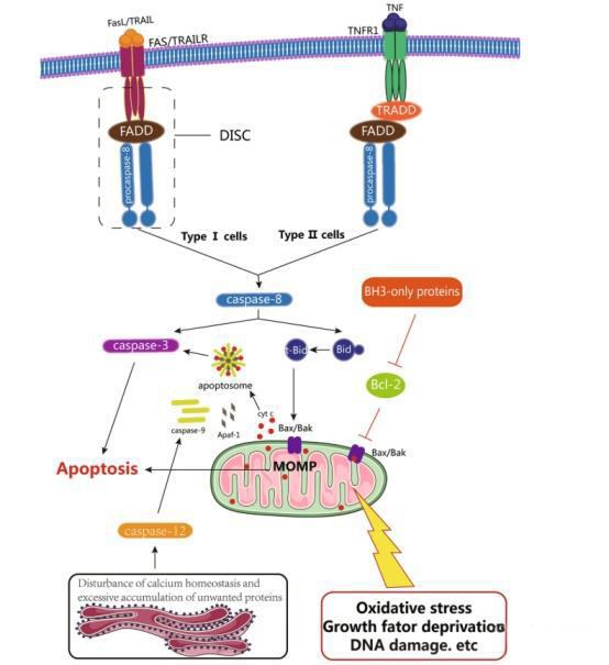 凋亡激活因子是促使细胞进入凋亡的因子。其中最重要的是细胞因子和细胞内信号传导通路。细胞因子包括肿瘤坏死因子(TNF)和细胞因子受体超家族(TNFRSF)成员。细胞内信号传导通路主要包括线粒体途径和线粒体外途径。线粒体途径通过释放线粒体内的细胞色素C来激活半胱天冬酶家族蛋白酶(caspase),从而激活凋亡。线粒体外途径主要通过活化TNFRSF家族成员激活半胱天冬酶家族蛋白酶,进而激活凋亡。
